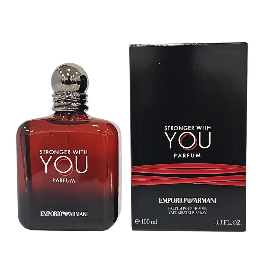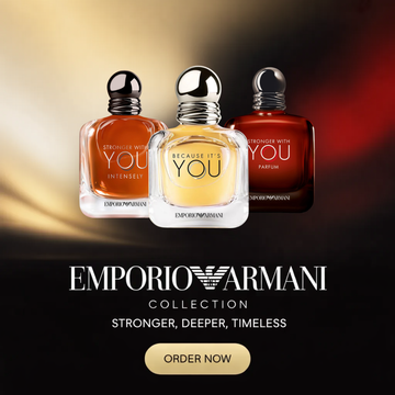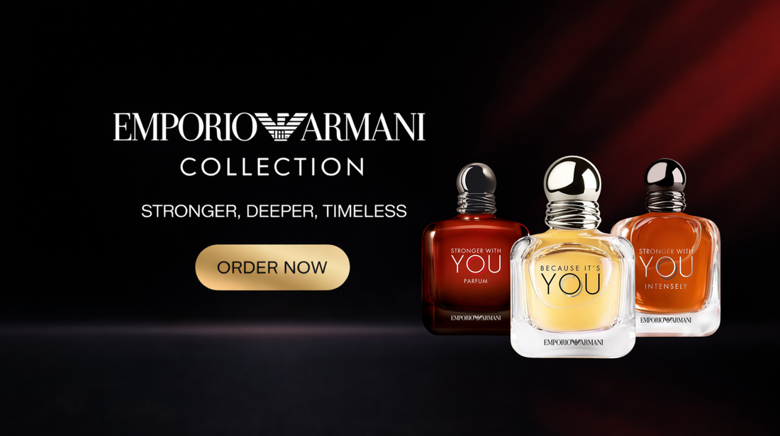 The second visual showcases the bold and modern appeal of the Emporio Armani “Stronger With You” fragrance range. With deeper tones and rich color contrasts, the design conveys warmth, intensity, and strength. The bottles are placed prominently to emphasize their unique identity, while the dark gradient background adds depth and drama to the composition. The strong branding and clean text placement keep the focus on the product while maintaining a sleek and contemporary look. This visual reflects confidence, passion, and a youthful energy, making it appealing to those who prefer powerful and long-lasting fragrances.