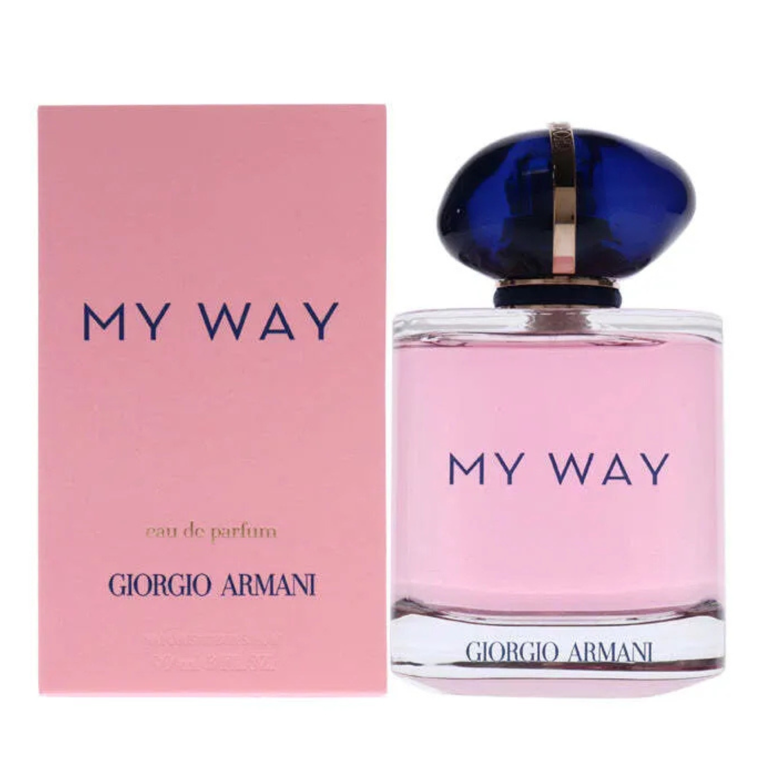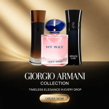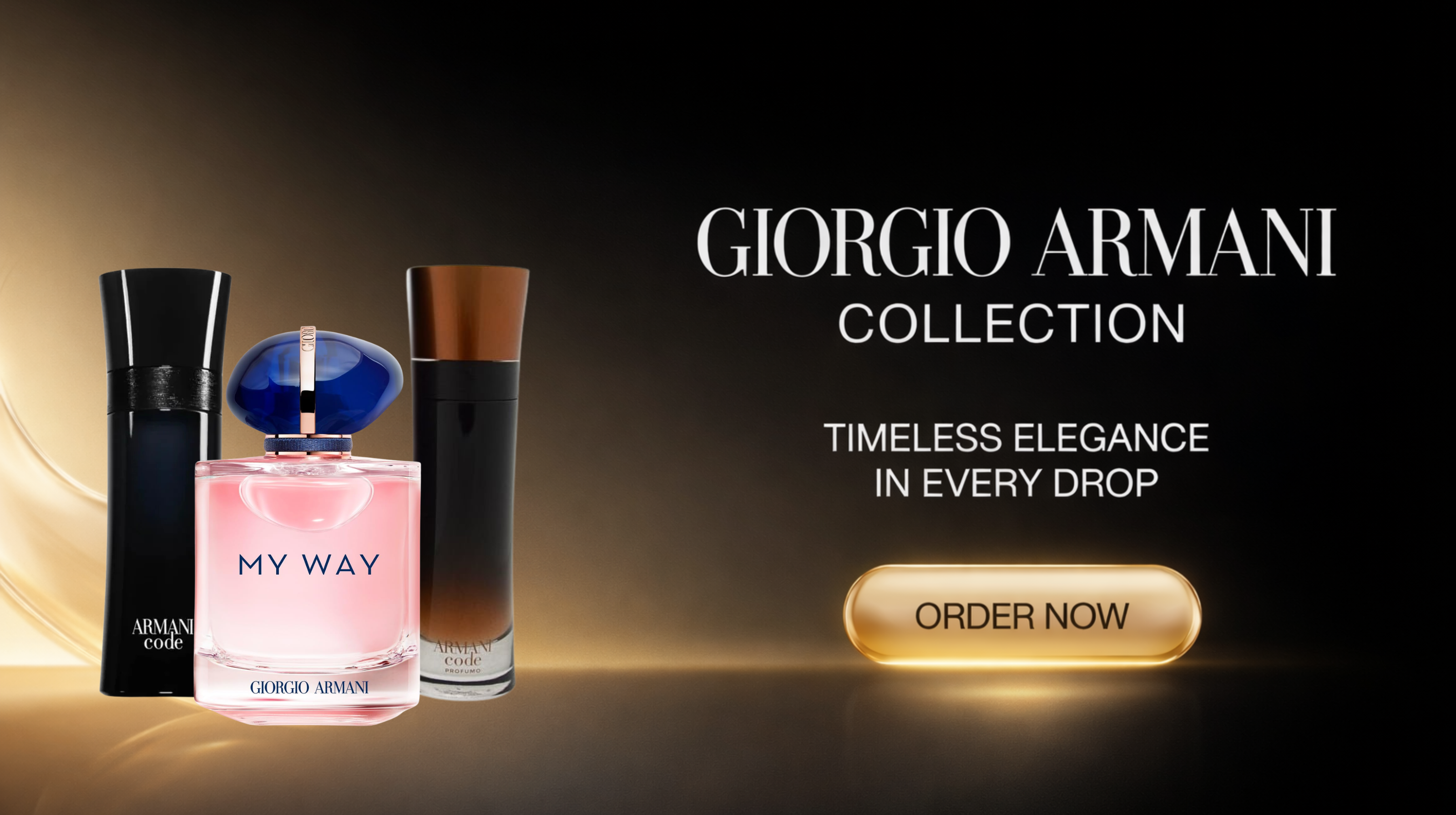 The first visual represents the elegance and sophistication of the Giorgio Armani fragrance line, featuring a refined trio of perfumes including the iconic “My Way.” Set against a soft golden background, the design creates a luxurious and premium feel that immediately captures attention. The smooth lighting and minimal composition highlight the beauty of the bottles while maintaining a classy and modern aesthetic. The clean typography and centered layout further enhance the brand’s identity, making the overall presentation look polished and high-end. This visual perfectly reflects timeless beauty, confidence, and the signature elegance associated with Giorgio Armani fragrances.